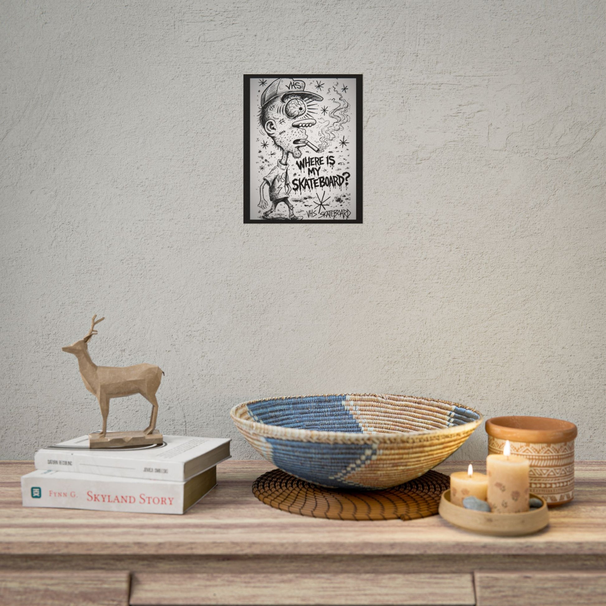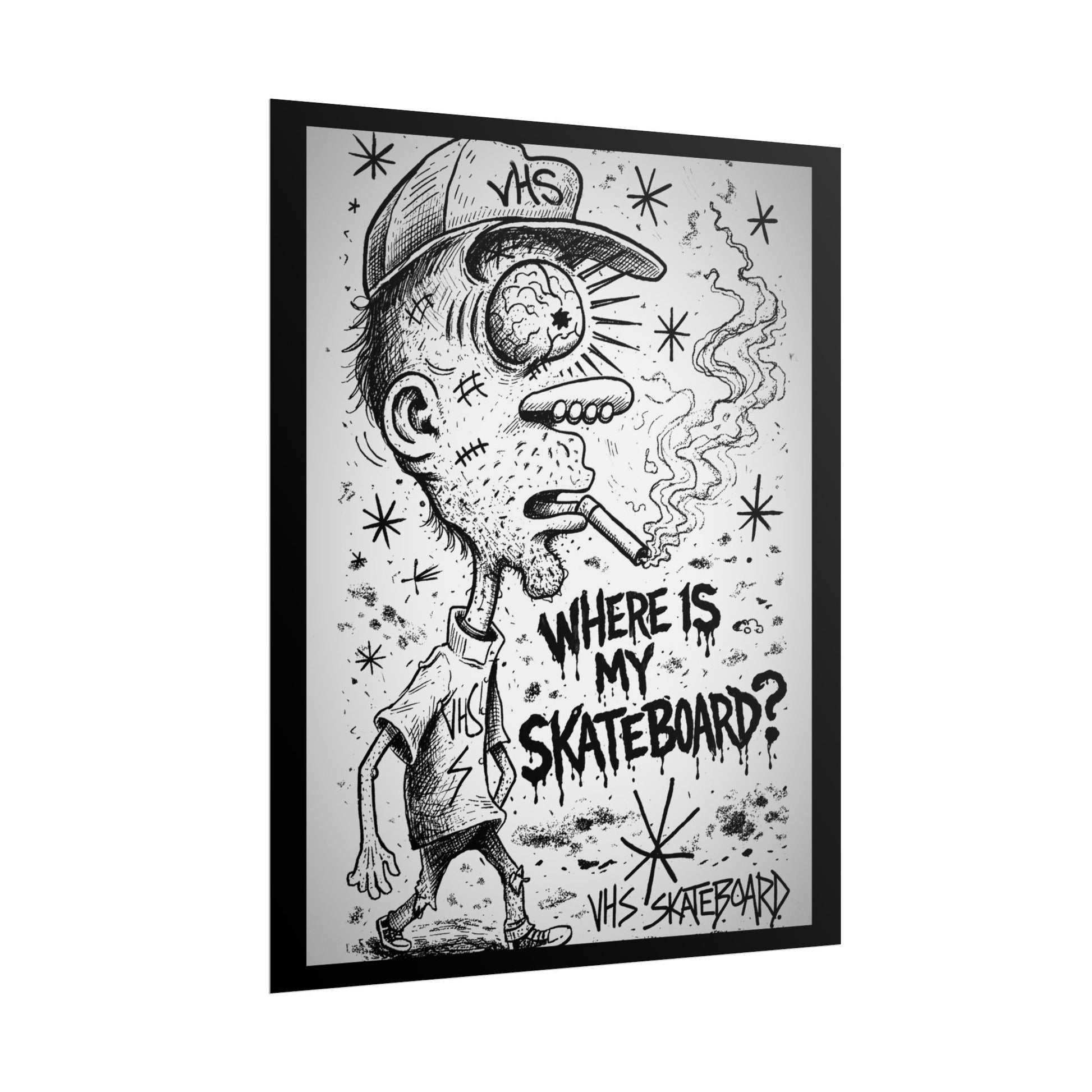 Hand-inked, black-and-white skate-punk art printed with archival inks. This rolled poster captures a gritty, late-night street energy — a wide-eyed skater, cigarette smoke curling into starry scribbles, and the urgent question: “Where is my skateboard?” It feels like a found zine page stuck to a garage door, ready to add raw character to a bedroom wall, skate den, or studio. Choose fine art paper for a soft textured, museum-like finish; matte for a subdued, low-sheen look; or semi-glossy for punchy contrast and sharp detail. Available in horizontal and vertical layouts and multiple sizes so you can place it above a desk, over a beanbag, or framed by your favorite board stickers.