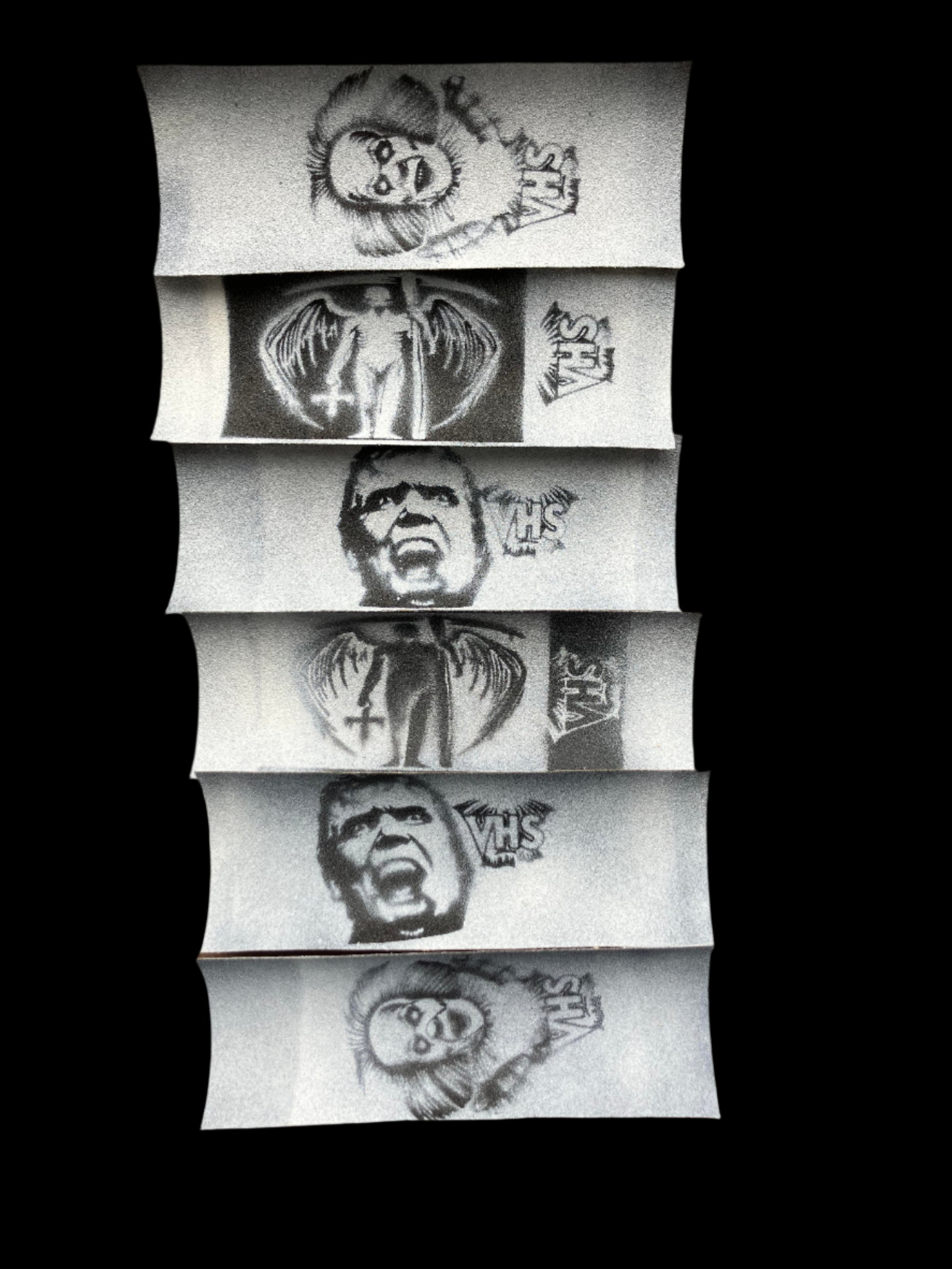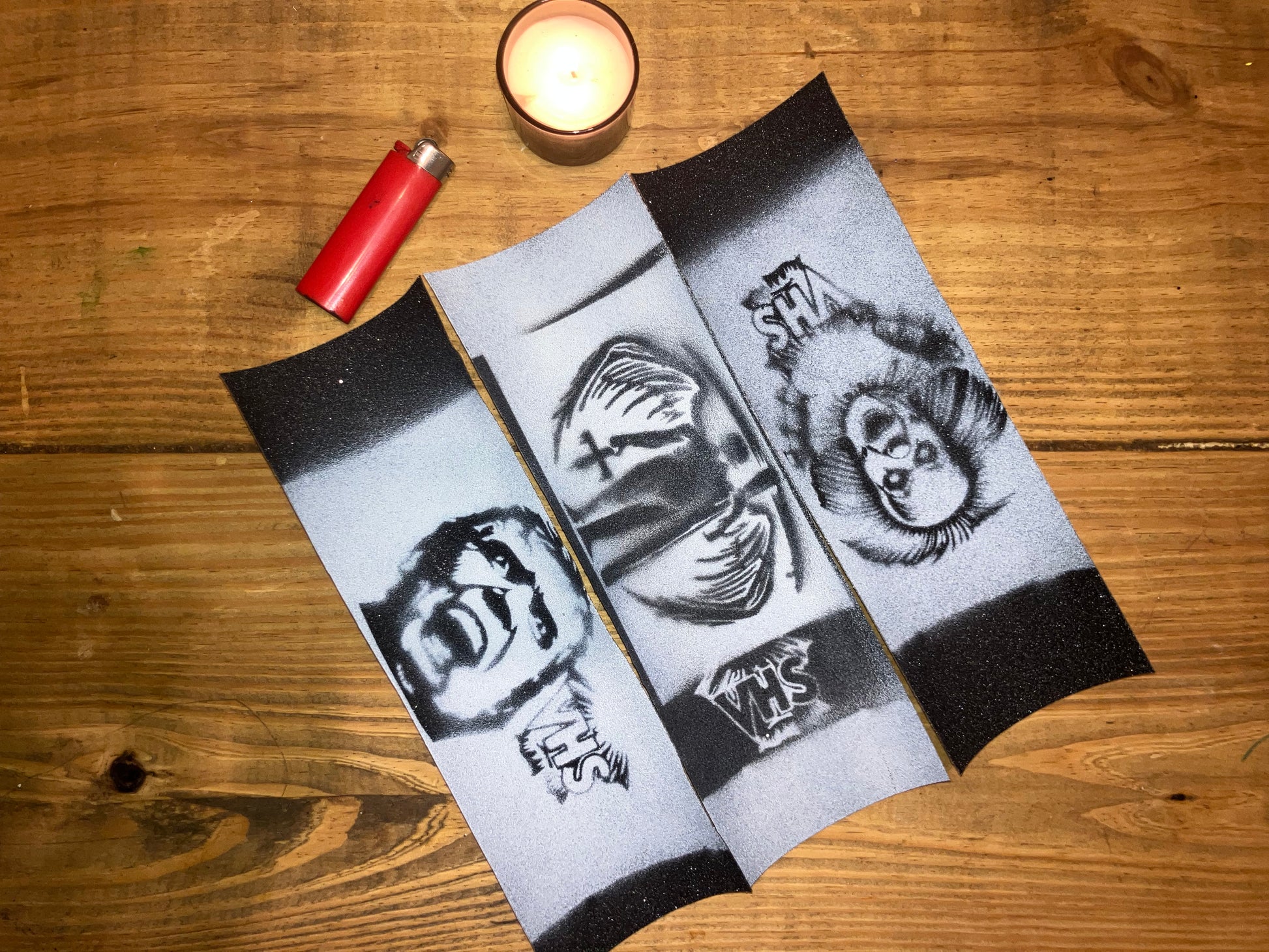 Get killer grip and a collection of hand made VHS art work for only $10 with these 1-1 grip strips featuring themes from our favorite classic horror films on professional 80grit griptape that will give you sure footing, but freedom of movement.